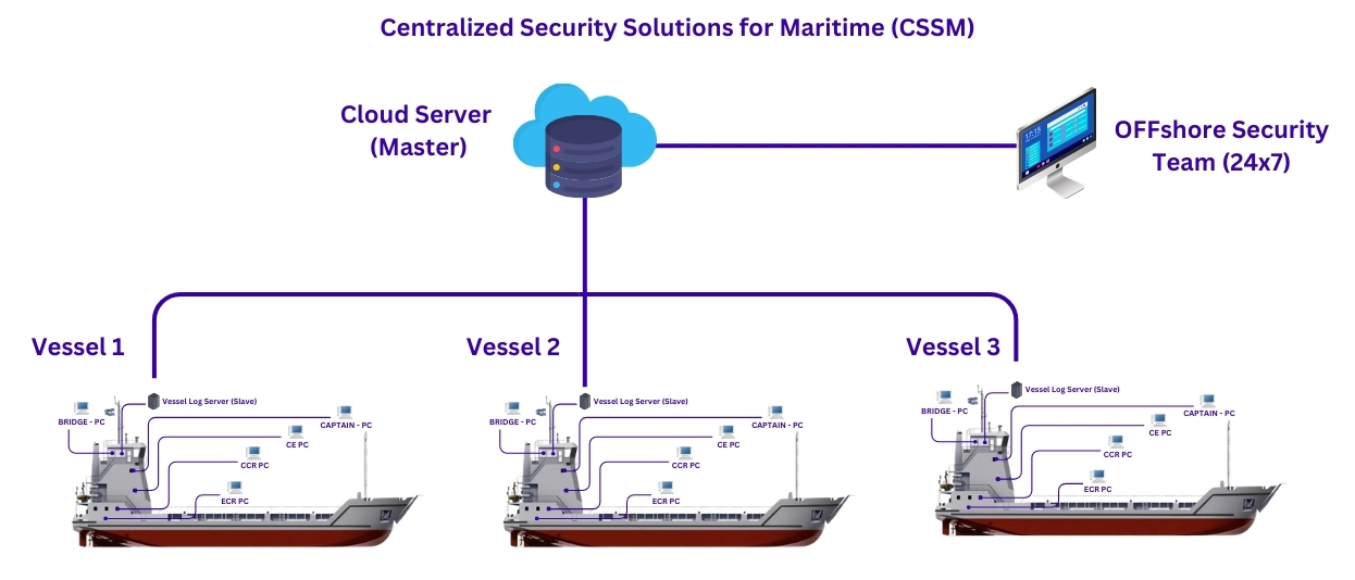 Codesecure Solutions implemented a cloud-based security architecture designed specifically for the maritime industry. The solution connects and monitors multiple vessels from a dedicated cloud platform, enabling secure, centralized management of all systems. The architecture works as follows: